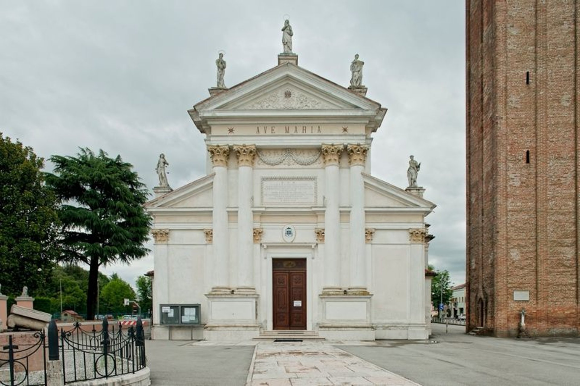 Il fronte è tripartito da due binati di semicolonne con capitello ionico e poggianti su un unico alto basamento. Nella parte centrale superiore, tra i capitelli delle semicolonne, è presente una decorazione a festoni, sopra la quale è impostato un cornicione, con l’iscrizione “Ave Maria”, che termina con un timpano triangolare sul quale sono presenti cinque statue. Nel 1960 viene aggiunto il transetto a due campate e viene ingrandita la zona presbiterale.